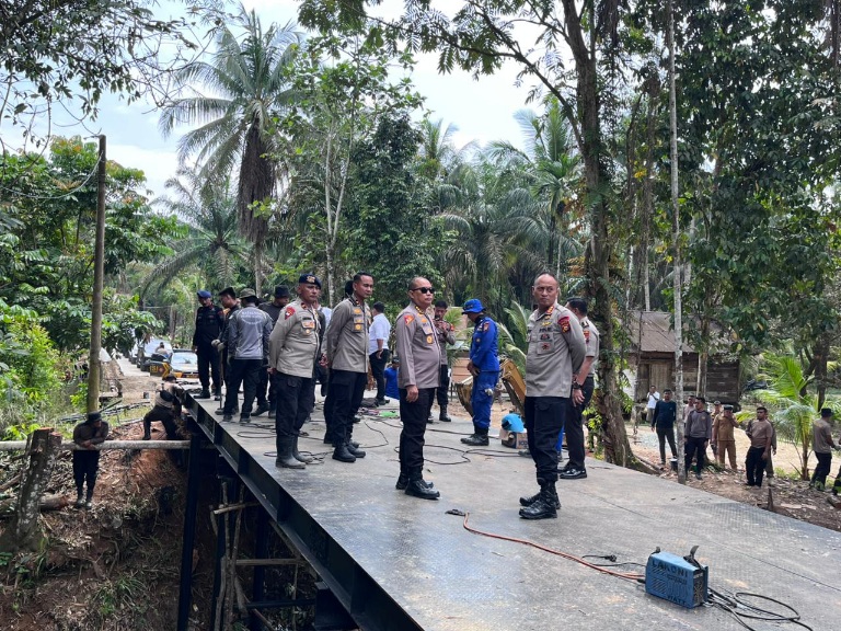 Dansat Brimob dan Karo Ops Polda Riau Tinjau Pembangunan Jembatan di Desa Lubuk Agung