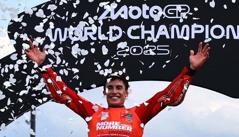 Marc Marquez unggul 201 poin dari rival terdekatnya Alex Marquez (2) dan mengingat MotoGP 2025 tinggal menyisakan lima seri (185 poin), perolehan angka Marc Marquez mustahil bisa dilampaui.