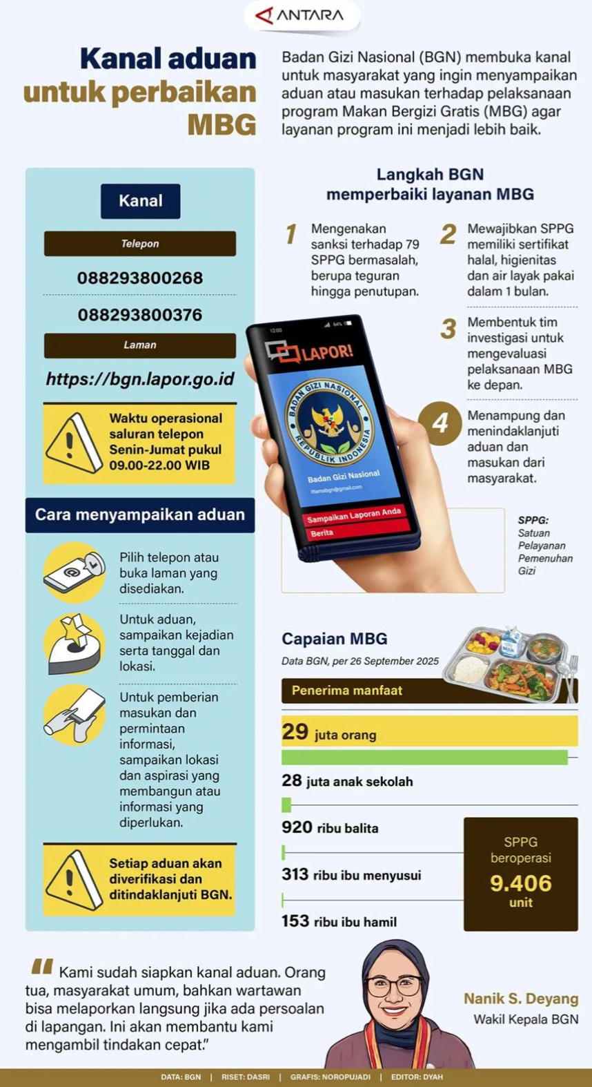 Badan Gizi Nasional (BGN) membuka kanal untuk masyarakat yang ingin menyampaikan aduan atau masukan terhadap pelaksanaan program Makan Bergizi Gratis (MBG) agar layanan program ini menjadi lebih baik. (ant)